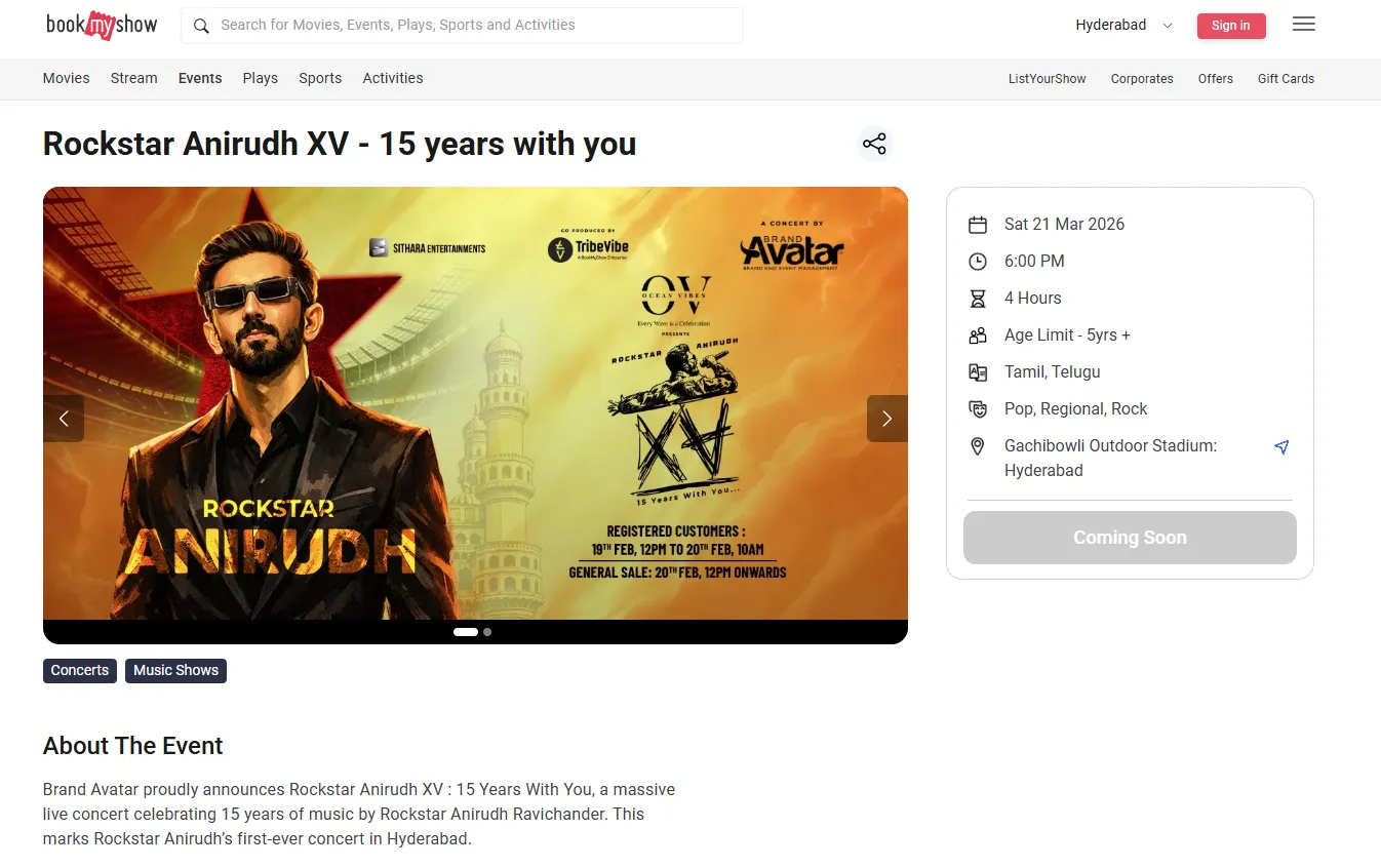 అనిరుధ్ రవిచందర్ తొలి హైదరాబాద్ లైవ్ కాన్సర్ట్ మార్చి 21, 2026న గచ్చిబౌలి ఇండోర్ స్టేడియంలో జరగనుంది. 30,000 టికెట్లకు 1.5 లక్షలకుపైగా డిమాండ్ రావడంతో టికెట్స్ వేగంగా సేల్ అవుతున్నాయి. 2000-6000 రేట్లు ఉన్నా అభిమానులు ఉత్సాహంగా బుక్ చేస్తున్నారు.