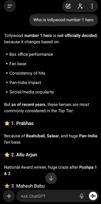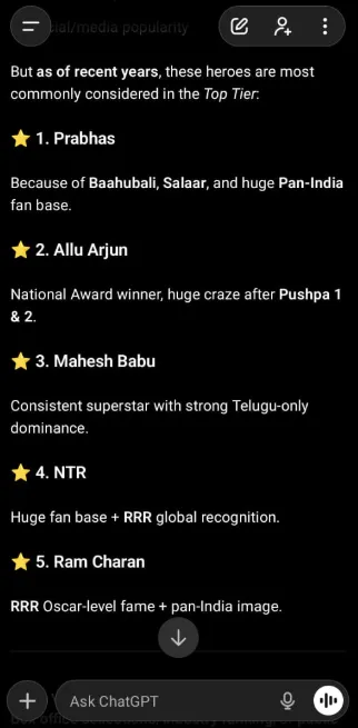 అందరూ తెలుసుకోవాల్సింది ఏమిటంటే, ఈ ర్యాంకింగ్ ఫ్యాన్స్ అభిప్రాయం కంటే భిన్నంగా ఉండొచ్చు. కానీ, AI సమాధానాలు ఇప్పటి టాలీవుడ్ పరిస్థితులను అంచనా వేస్తూ, హీరోల గుర్తింపు, అభిమానుల క్రేజ్, సోషల్ మీడియా ట్రెండ్స్ ఆధారంగా ఇచ్చిన ఆసక్తికర ఫలితాలు కాబట్టి, ఇవి కొత్త చర్చలకు కారణం అయ్యాయి.