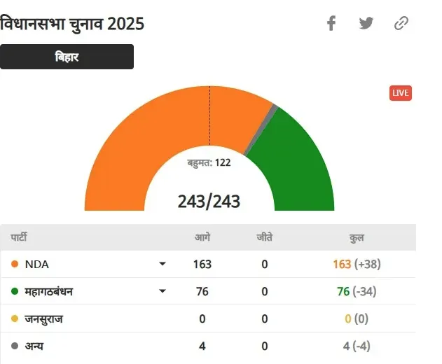 • ప్రతిపక్ష మహాఘట్‌బంధన్ కేవలం 50 స్థానాల్లో మాత్రమే ఆధిక్యంలో ఉంది.