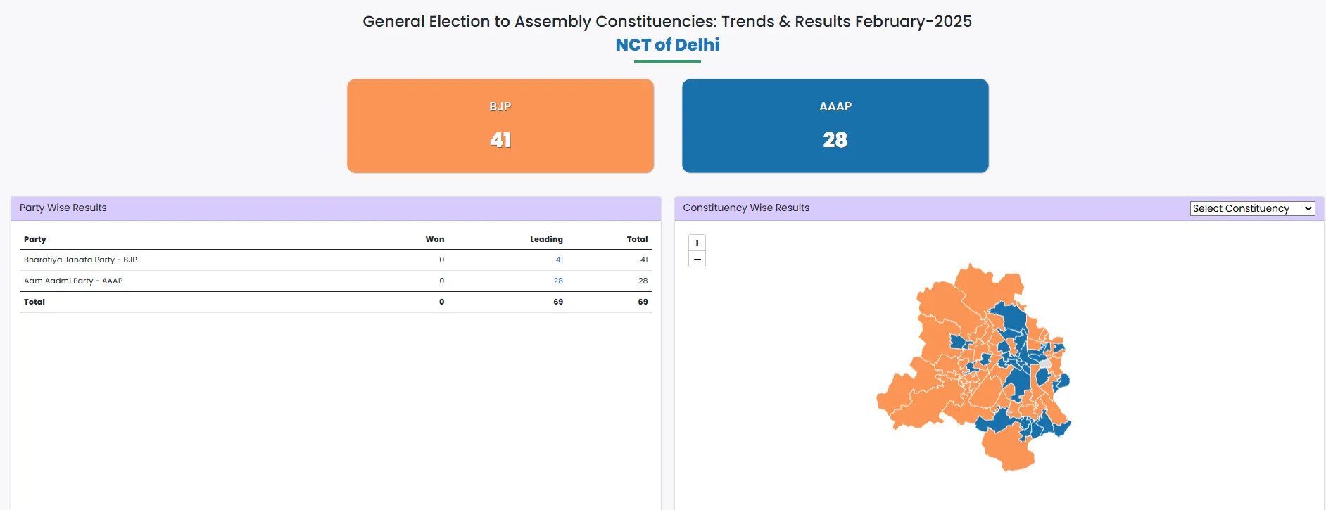 తాజా ట్రెండ్స్ ప్రకారం బీజేపీ 46 స్థానాల్లో ముందంజ, ఆప్ 24 స్థానాల్లో ఆధిక్యం.