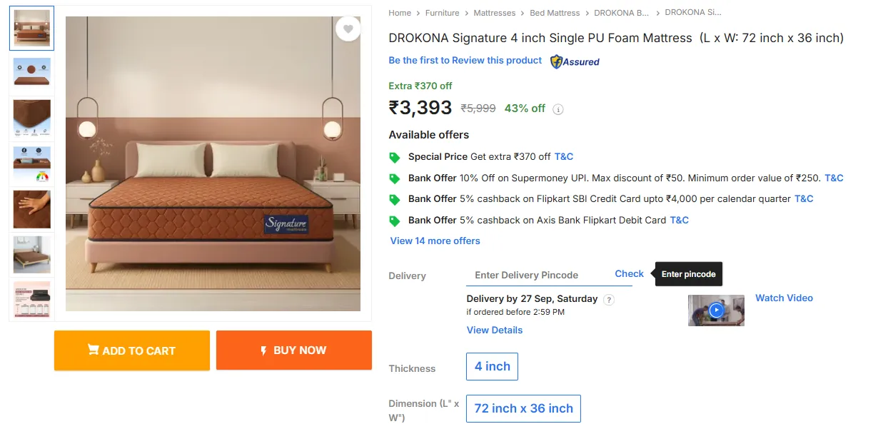 ఫ్లిప్కార్ట్లో అందుబాటులో ఉన్న మరొక బెస్ట్ బెడ్ DROKONA Signature 4 inch Single PU Foam Mattress. దీని ధర కొంచె ఎక్కువగా ఉంటుంది. సింగిల్ సైజ్, 4 ఇంచుల బెడ్ అసలు రూ. 5,999 ఉండగా.. ఇప్పుడు కేవలం రూ.3,393లకే సొంతం చేసుకోవచ్చు. దీనిపై అదనంగా మరో రూ.370 డిస్కౌంట్ లభిస్తోంది. అలాగే బ్యాంక్ ఆఫర్లు కూడా లభిస్తున్నాయి. వీటన్నింటితో దీనిని కేవలం రూ.3వేలలోపే సొంతం చేసుకోవచ్చు.