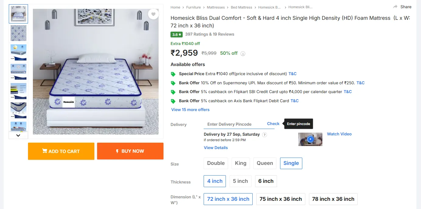 ఫ్లిప్కార్ట్లో Homesick Bliss Dual Comfort - Soft & Hard 4 inch Single High Density (HD) Foam Mattress అతి తక్కువ ధరకే అందుబాటులో ఉంది. ఇందులో ఒకరికి, ఇద్దరికి, ముగ్గురికి, నలుగురికి సరిపడా బెడ్ సైజ్లు ఉన్నాయి. వీటితోపాటు 4 ఇంచెస్, 5 ఇంచెస్, 6 ఇంచెస్ కూడా ఉన్నాయి. ఈ బెడ్లు వాటి సైజ్లు, ఇంచుల బట్టి ధరలు నిర్ణయించారు. వీటిలో సింగిల్ సైజ్, 4 ఇంచుల బెడ్ అసలు ధర రూ.5,999గా ఉంది. ఇప్పుడు వీటిపై 50 శాతం డిస్కౌంట్ లభిస్తోంది. ఈ తగ్గింపుతో దీనిని కేవలం రూ.2,959లకే సొంతం చేసుకోవచ్చు. అలాగే బ్యాంక్ ఆఫర్లు కూడా ఉన్నాయి. వాటితో మరింత తక్కువ ధరకే కొనుక్కోవచ్చు. నో కాస్ట్ ఈఎంఐ ఆప్షన్ కూడా ఉంది. అలాగే ఒక సంవత్సరం వారంటీ అందిస్తోంది.