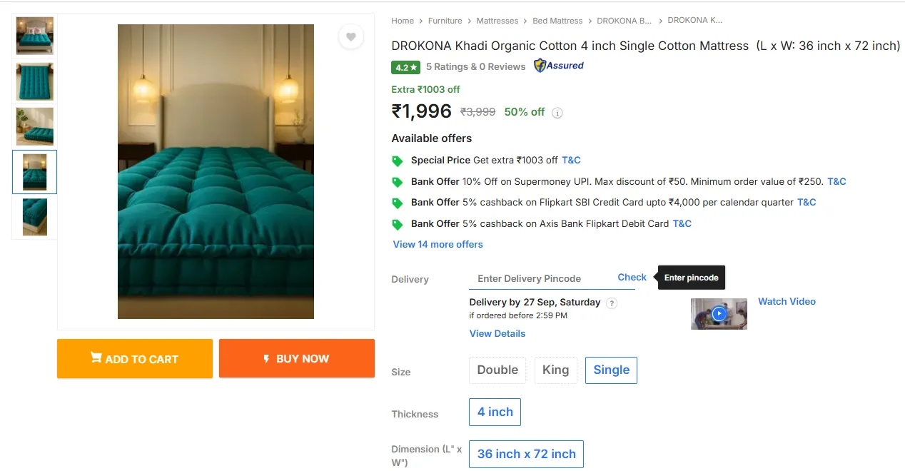 ఫ్లిప్కార్ట్లో అందుబాటులో ఉన్న మరో చీపెస్ట్ బెడ్ DROKONA Khadi Organic Cotton 4 inch Single Cotton Mattress. ఇది కూడా పలు సైజ్లలో అందుబాటులో ఉంది. దీని సింగిల్ సైజ్, 4 ఇంచుల బెడ్ అసలు ధర రూ.3,999 ఉండగా ఇప్పుడు కేవలం రూ.1,996లకే సొంతం చేసుకోవచ్చు. దీనిపై కూడా ఈఎంఐ ఆఫర్ ఉంది. అలాగే 6 నెలల వారంటీ కూడా కంపెనీ అందిస్తోంది.