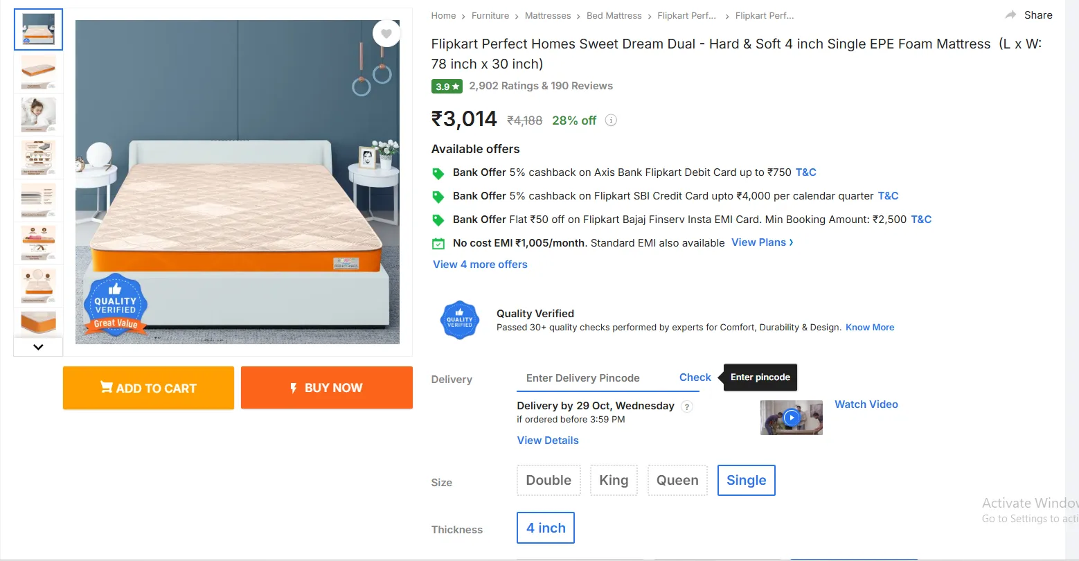 ఫ్లిప్ కార్ట్ లో Flipkart Perfect Homes Sweet Dream Dual - Hard & Soft 4 inch Single EPE Foam Mattress పై భారీ తగ్గింపు ఉంది. ఇది కూడా సింగిల్ సైజ్ 4 ఇంచుల బెడ్. దీని అసలు ధర రూ.4,188 ఉండగా.. ఇప్పుడు 28 శాతం తగ్గింపుతో కేవలం రూ.3,014లకే కొనుక్కోవచ్చు.