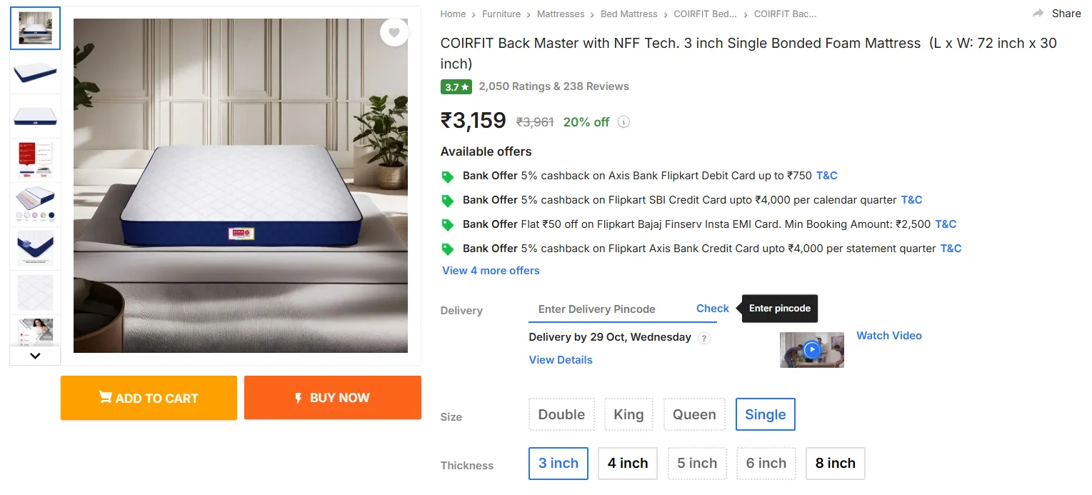 ఫ్లిప్ కార్ట్ లో COIRFIT Back Master with NFF Tech. 3 inch Single Bonded Foam Mattress అతి తక్కువ ధరకే లభిస్తుంది. దీని అసలు ధర రూ.3,961 కాగా.. ఇప్పుడు కేవలం రూ.3,159లకే సొంతం చేసుకోవచ్చు. ఇది సింగిల్ సైజ్ 3 ఇంచుల బెడ్.