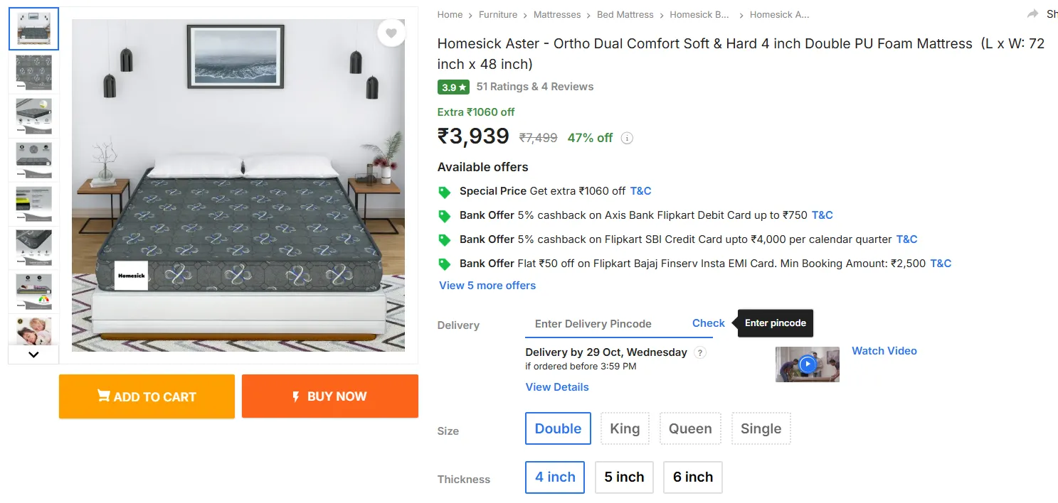 ప్రముఖ ఈ కామర్స్ ప్లాట్ ఫార్మ్ ఫ్లిప్ కార్ట్ లో బెడ్ (మాటర్స్)పై భారీ తగ్గింపు ఆఫర్లు అందుబాటులో ఉన్నాయి. దసరా, దీపావళి సేల్స్ ఇటీవల ముగిసినప్పటికీ ఇప్పుడు ఫ్లిప్ కార్ట్ వీటిపై అదిరిపోయే డిస్కౌంట్లు అందిస్తుంది. ఇప్పుడు వాటి గురించి పూర్తిగా తెలుసుకుందాం.