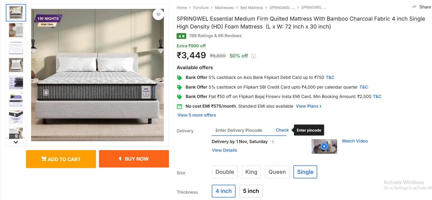 ఫ్లిప్ కార్ట్ లో SPRINGWEL Essential Medium Firm Quilted Mattress పై అదిరిపోయే ఆఫర్ అందుబాటులో ఉంది. ఇది పలు సైజ్ లలో లభిస్తుంది. అందులో సింగిల్ సైజ్ 4 ఇంచుల బెడ్(Mattress Offers) అసలు ధర రూ.6,899 ఉండగా.. ఇప్పుడు 50 శాతం తగ్గింపు అంటే సగం ధరకే కొనుక్కోవచ్చు. ప్రస్తుతం ఇది కేవలం రూ.3,449లకే అందుబాటులో ఉంది. దీనిపై బ్యాంక్ ఆఫర్లు కూడా ఉన్నాయి. వాటి ద్వారా దీని ధరను మరింత తగ్గించుకోవచ్చు.