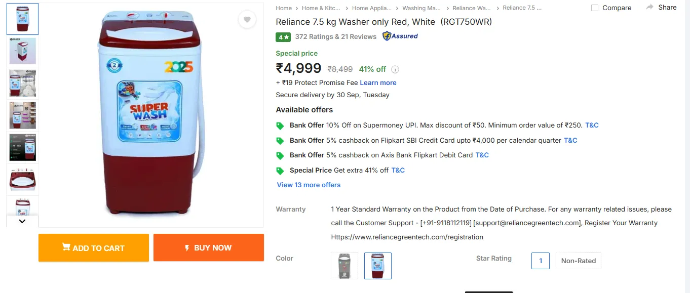 ఫ్లిప్కార్ట్లో Reliance 7.5 kg Washer తక్కువ ధరలో అందుబాటులో ఉంది. ఇది 7.5 kgలతో వస్తుంది. రెడ్, వైట్ కలర్లో లభిస్తుంది. ఇది రూ.8,499కు లాంచ్ కాగా.. ఇప్పుడు 41శాతం తగ్గింపుతో కేవలం రూ.4,999లకే అందుబాటులో ఉంది. దీనిపై బ్యాంక్ ఆఫర్లు సైతం ఉన్నాయి. వీటితో మరింత తక్కువ ధరకే పొందొచ్చు.