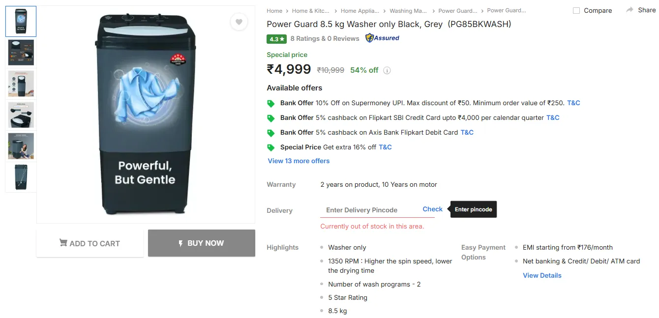 Power Guard 8.5 kg Washer అసలు ధర రూ.10,999 ఉండగా.. ఇప్పుడు రూ.4,999లకు సొంతం చేసుకోవచ్చు. ఇది బ్లాక్, గ్రే కలర్ ఆప్షన్లలో లభిస్తుంది. దీనిపై కూడా పలు బ్యాంక్ ఆఫర్లున్నాయి. ఇది 8.5కేజీలతో వస్తుంది.
