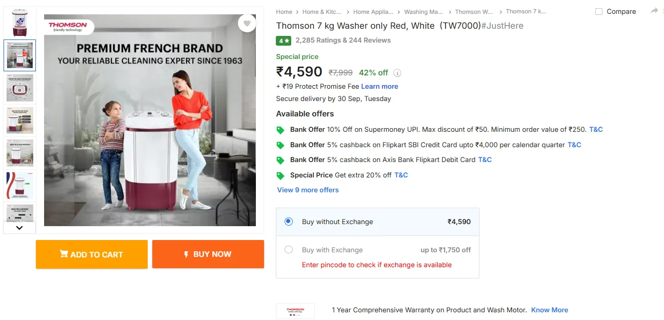 Thomson 7 kg Washer అసలు ధర రూ.7,999 ఉండగా.. ఇప్పుడు రూ.4,590లకు సొంతం చేసుకోవచ్చు. ఇది రెడ్, వైట్ కలర్ ఆప్షన్లలో లభిస్తుంది. దీనిపై కూడా పలు బ్యాంక్ ఆఫర్లున్నాయి. ఇది 7 కేజీలతో వస్తుంది.