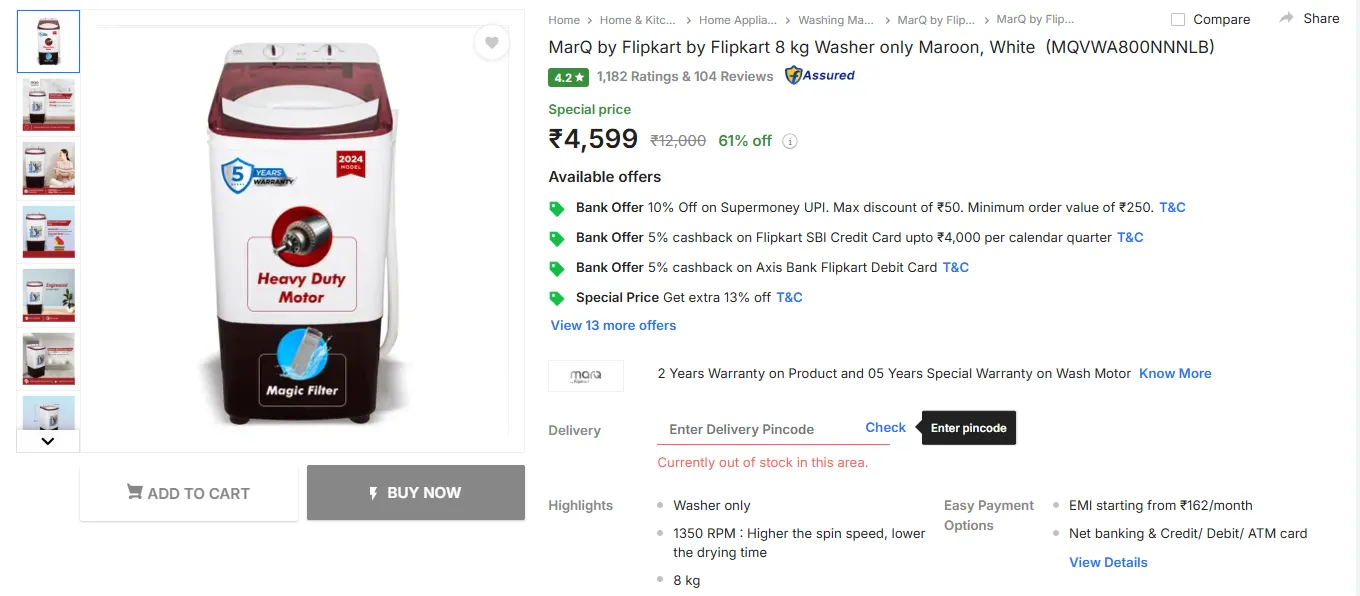 ఫ్లిప్కార్ట్లో MarQ 8 kg Washerపై భారీ ఆఫర్ ఉంది. రూ.12,000 ధర ఉన్న ఈ వాషింగ్ మెషీన్ ఇప్పుడు ఫ్లిప్కార్ట్ సేల్లో కేవలం రూ.4,599లకే లభిస్తోంది. దీనిపై కూడా బ్యాంక్ ఆఫర్లు ఉన్నాయి. ఇది 8కేజీలతో వస్తుంది.