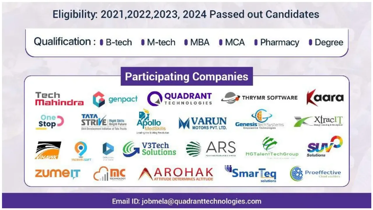 విద్యార్హతలు: డిగ్రీ, బీటెక్, ఎంటెక్, ఎంబీఏ, ఎంసీఏ, ఫార్మసీ విద్యార్హత కలిగిన వారు ఈ జాబ్ మేళాకు హాజరుకావొచ్చు. 2021, 2022, 2023, 2024లో పాసైన వారికి అవకాశం ఉంటుంది.